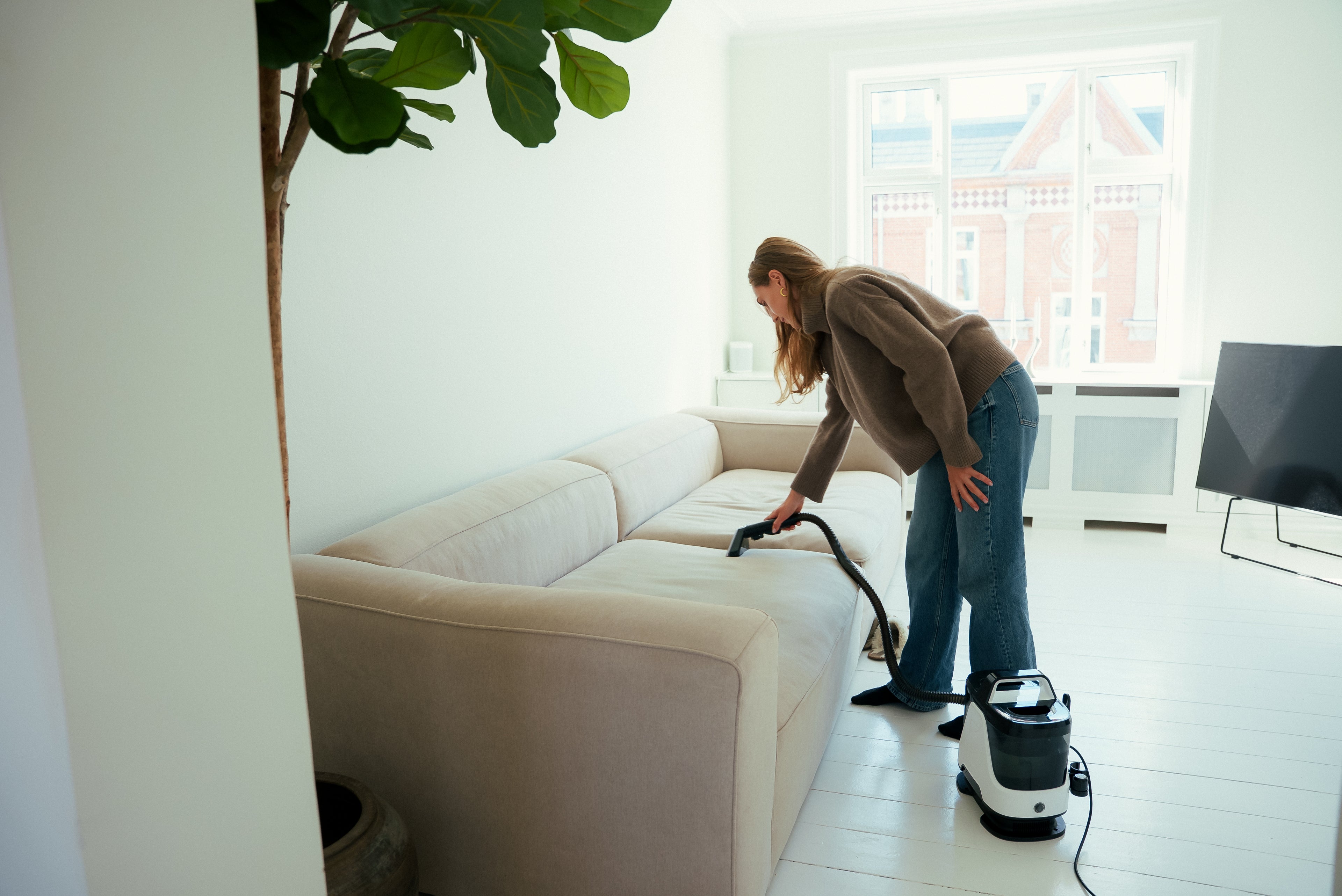 Nej. Stainaway Pro rengør med vand og mekanisk børstning – helt uden damp.